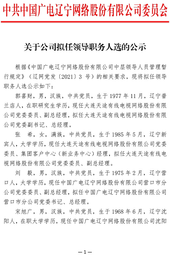 中國(guó)廣電遼寧網(wǎng)絡(luò)股份有限公司(簡(jiǎn)稱中國(guó)廣電遼寧公司)前身為成立于2010年2月的北方聯(lián)合廣播電視網(wǎng)絡(luò)股份有限公司,系中央國(guó)有文化企業(yè)——中國(guó)廣電網(wǎng)絡(luò)股份有限公司省級(jí)子公司、遼寧省國(guó)有文化高新技術(shù)企業(yè),是按照現(xiàn)代企業(yè)制度打造的集網(wǎng)絡(luò)建設(shè)、傳輸、運(yùn)營(yíng)及多功能開發(fā)與應(yīng)用為一體綜合網(wǎng)絡(luò)運(yùn)營(yíng)商。
