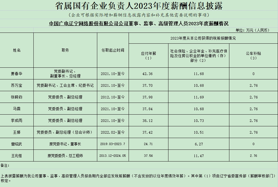 中國(guó)廣電遼寧網(wǎng)絡(luò)股份有限公司公司董事、監(jiān)事、高級(jí)管理人員2023年度薪酬情況