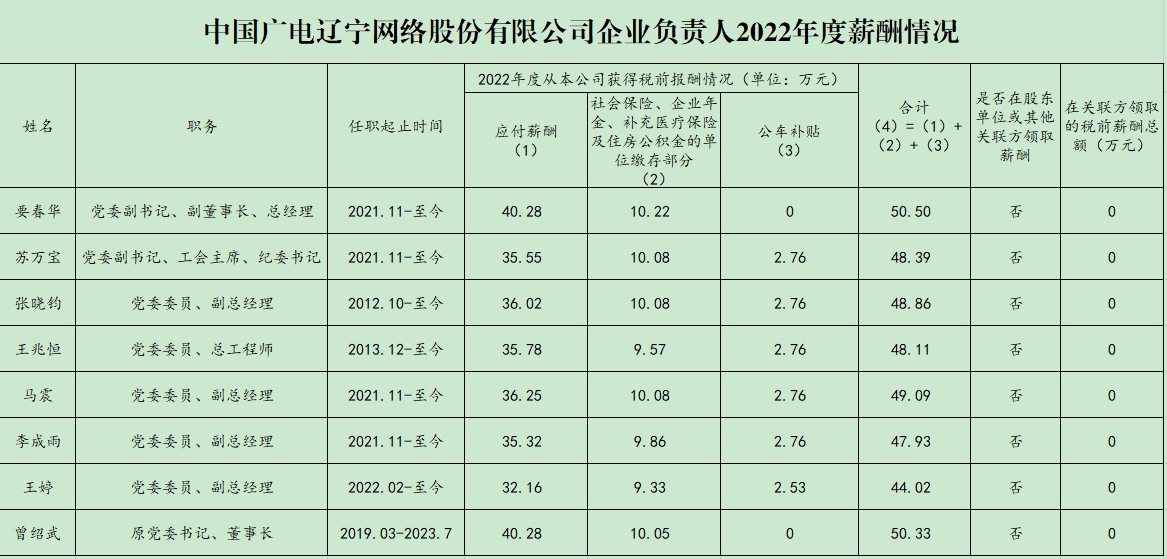 中國(guó)廣電遼寧網(wǎng)絡(luò)股份有限公司企業(yè)負(fù)責(zé)人2022年度薪酬情況